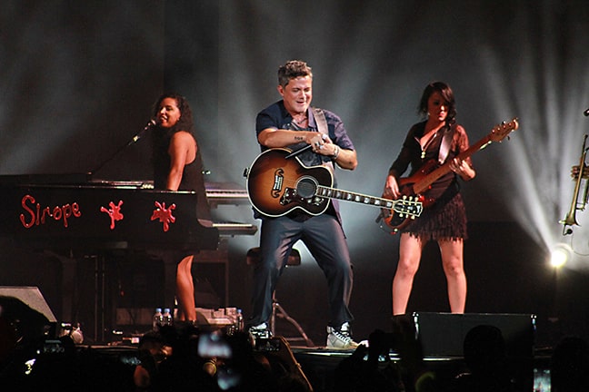 Sin dejar de mostrar ánimo y felicidad,Alejandro Sanz siguió brindando su canto,en diversas ocasiones del show invitó a cantar con él a su equipo de La Voz.