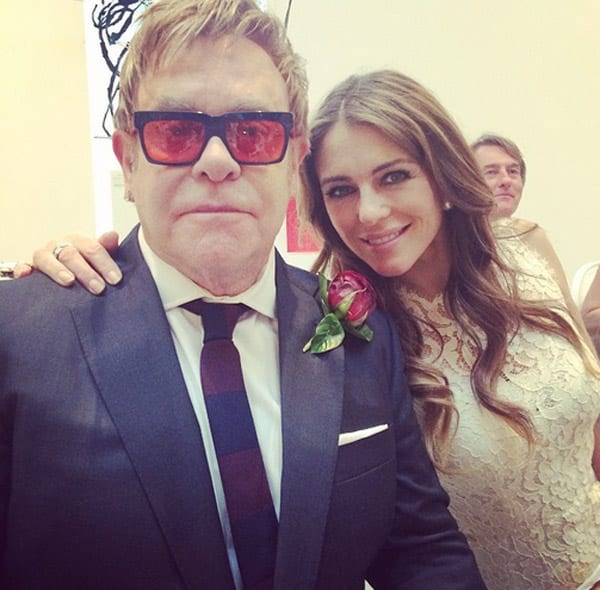 Entre los invitados se encontraba la actriz Liz Hurley, que publicó en Twitter una fotografía en la que aparece con su hijo y con el comentario: “De camino a la boda de Elton y David, muy emocionada”.