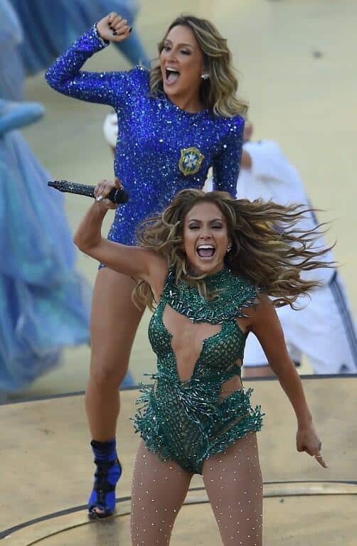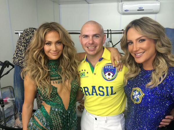 12 junio, 2014La ceremonia de inauguración del Mundial de Brasil 2014 brilló con la presencia de Jennifer Lopez, Claudia Leitte y el rapero Pitbull.Las estrellas pusieron en pie al público del estadio Arena de Sao Paolo cuando interpretaron la canción We are one (Ole Ola), himno de la ceremonia. Él, ataviado con pantalón blanco y la camiseta de la selección brasileña y ellas con sendos bodys, la brasileña de azul y la neoyorquina de verde. JLo no decepcionó y además de pierna enseñó escote, informa el Huffington Post.