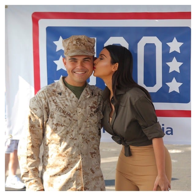 Asimismo, Kim -quien reveló recientemente su adicción a los selfis- no pudo evitar publicar una foto de sí misma rodeada de todos los marines vestidos de uniforme y otra en la que aparece besando a un afortunado joven.