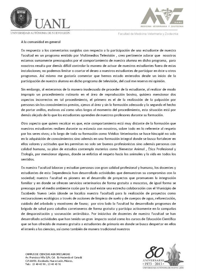 20 abril, 2013La Facultad de Medicina, Veterinaria y Zootecnia de la UANL descalificó el proceder de una de sus alumnas en el reality Mitad y Mitad de Multimedios Televisión al prestarse a una auscultación de una vaca sin los procedimientos médicos y éticos que se requieren.