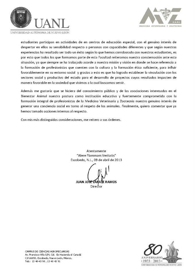“Son reprobales estas acciones, no estamos de acuerdo ni apoyamos el maltrato animal. Pedimos una disculpa sobre este hecho, puesto que no se pretendía maltratar al ser vivo, ni alterar la armonía de los hogares que nos sintonizan”, se indicó en el documento sin firma y bajo el nombre de Jesús Granados, que se ostenta como Jefe de Relaciones Públicas.