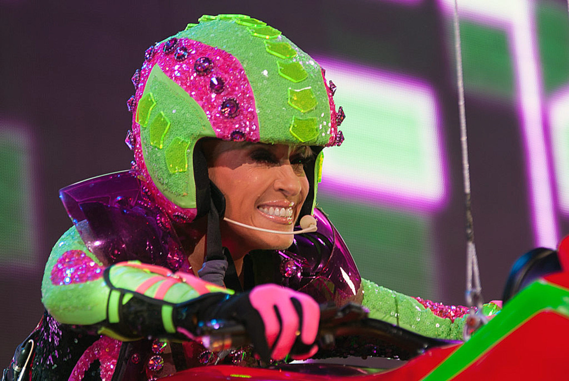 La cantante arrancó su show con el tema “Este Amor no se toca” y voló por los aires montada en una colorida motocicleta, que es lo más increíble del show que se coloca a la altura de grandes producciones de artistas internacionales.